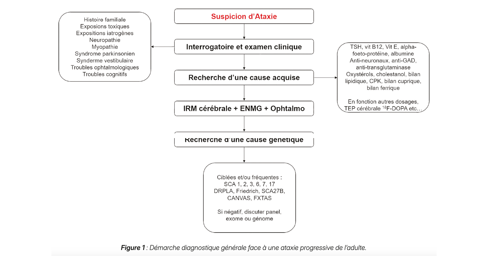Les ataxies cérébelleuses d'apparition tardive chez l'adulte constituent un défi diagnostique, en raison de la grande hétérogénéité de leurs causes potentielles. Face à un syndrome cérébelleux progressif apparaissant après l'âge de 40 ans, il faut distinguer les étiologies acquises (par exemple, causes vasculaires, inflammatoires ou toxiques) des formes neurodégénératives et/ou génétiques. Ces dernières sont majoritairement des ataxies héréditaires autosomiques dominantes débutant tôt dans la vie, mais des formes à début tardif existent1. Dans cet article, nous illustrons la démarche diagnostique au travers d'un cas clinique.