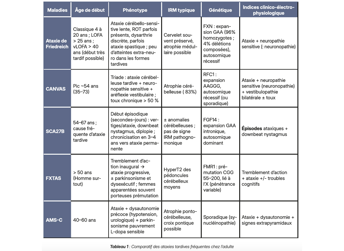 AMS-C = Atrophie Multisystématisée de forme Cérébelleuse ; CANVAS = Cerebellar Ataxia with Neuropathy and Vestibular Areflexia Syndrome ; FXTAS = Fragile X–Associated Tremor/Ataxia Syndrome ; LOFA = Late-Onset Friedreich Ataxia ; SCA27B = Spinocerebellar Ataxia type 27B ; vLOFA = Very Late-Onset Friedreich Ataxia.