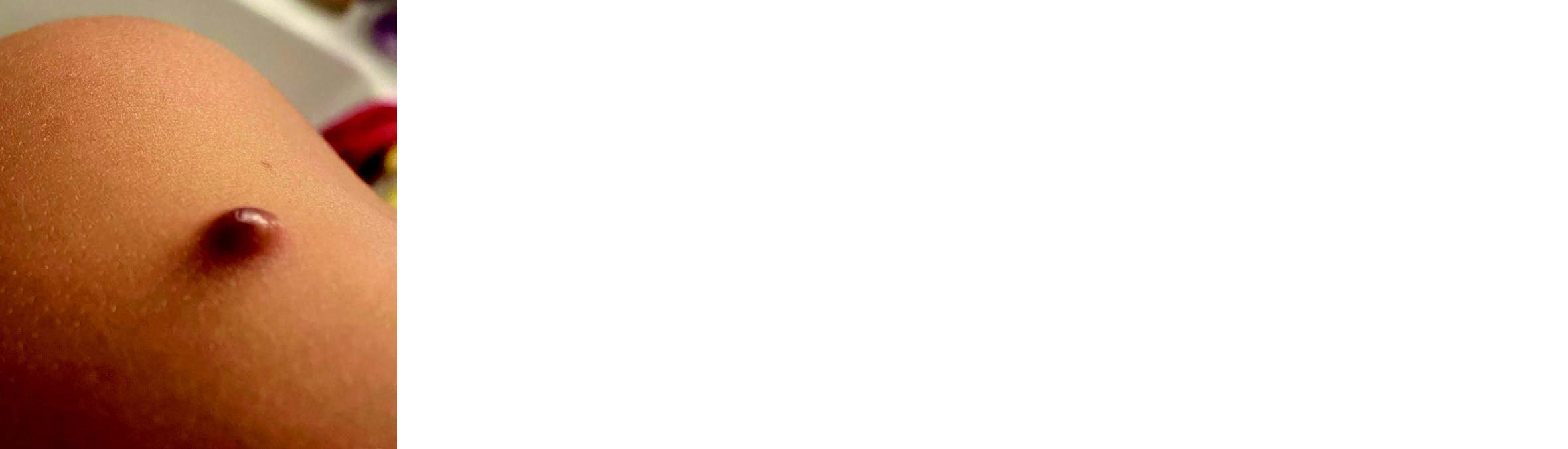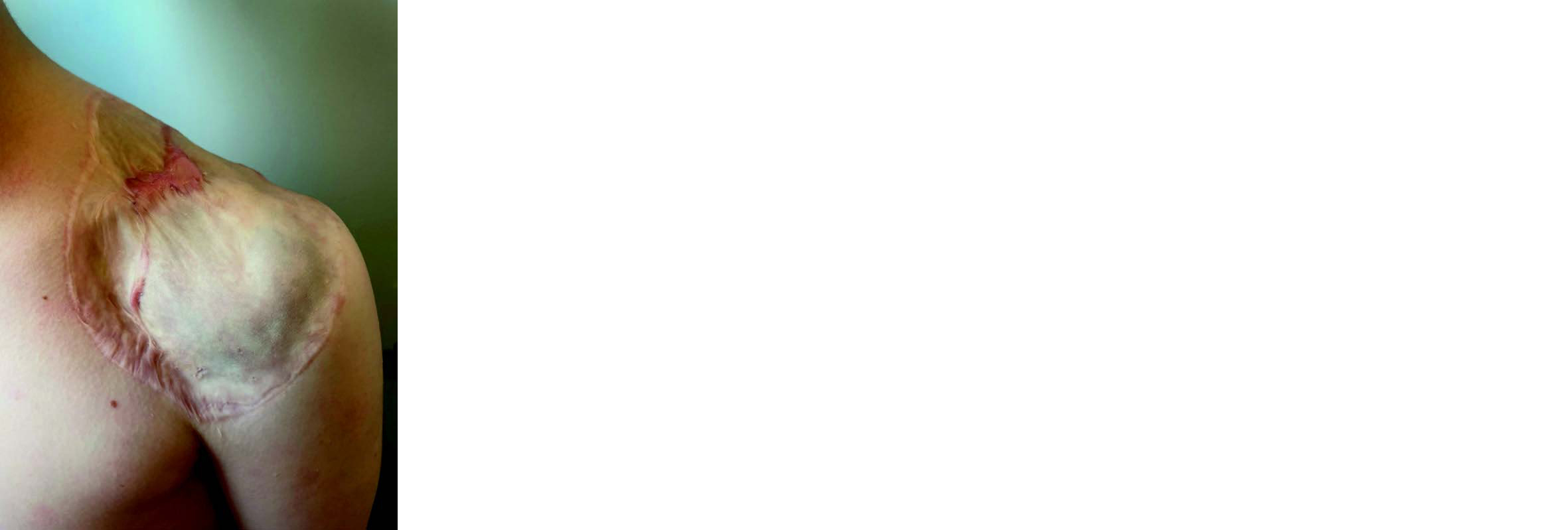Un enfant de 8 ans, sans antécédent, consultait pour un nodule tumoral pigmenté centimétrique de l'épaule, évolutif depuis 6 mois, induré et sensible à la palpation (Fig. 1A). L'exérèse confirmait le diagnostic suspecté d'histiocytofibrome (Fig. 1B). L'enfant était revu un an après devant une récidive de la lésion sur la cicatrice initiale et l'apparition de 2 nodules en regard de la tête humérale. L'exérèse large de la cicatrice et des 2 lésions périphériques était en limite non saine obligeant un geste complémentaire délabrant avec reconstruction par greffe de peau (Fig. 1C et 1D). Le suivi clinique et radiographique par IRM avec un recul d'1 an était rassurant.