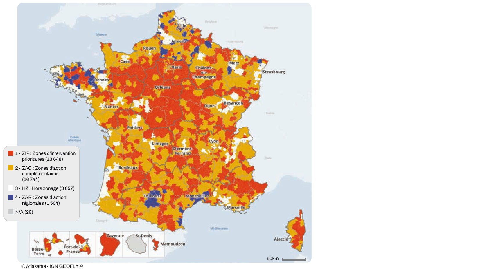 Les ZIP et ZAC sont considérées comme sous-dotées, donc toutes les zones rouges et oranges.