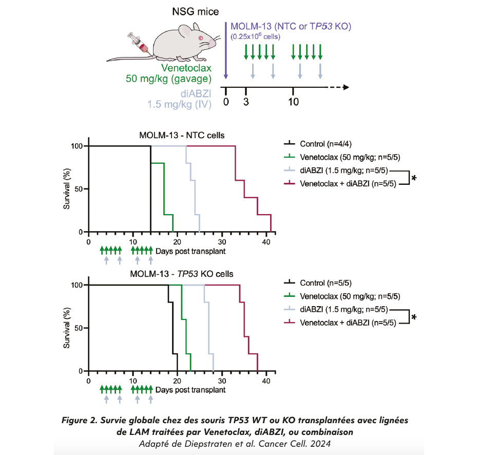Enfin, les auteurs ont voulu explorer la combinaison des BH3-mimétiques avec les agonistes de STING. Dans les lignées TP53-KO, la combinaison d'un BH3-mimétique et d'un agoniste STING (diABZI) induit une perte de viabilité bien supérieure à celle obtenue avec chaque agent seul. Un point important est que l'eff et des agonistes STING requière un haut niveau d'expression de STING comme c'est le cas dans les lymphomes T/NK extra-nodal ou dans les LAM, mais pas dans les lymphomes B par exemple. Cette stratégie combinatoire a finalement été validée in vivo sur des souris transplantées avec lignées de lymphome T/NL extra-nodal, et avec des lignées de LAM (MOLM-13, Figure 2), ainsi qu'avec des modèles de xénogreff es dérivés de patients.
