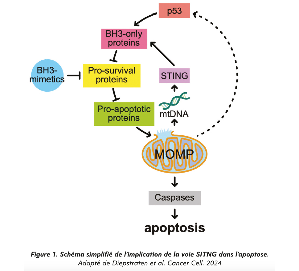 Cette étude propose un changement de paradigme dans la compréhension de l'action des BH3-mimétiques. Loin d'agir uniquement comme inhibiteurs directs de BCL-2 ou MCL-1, ces molécules induisent, dans les cellules TP53-sauvages, une réponse transcriptionnelle secondaire dépendante de p53, qui amplifie le signal apoptotique via l'induction des eff ecteurs BH3-only. Les auteurs démontrent que cette dépendance à p53 peut être contournée par une activation pharmacologique de la voie STING. En déclenchant la phosphorylation d'IRF3, cette activation induit une expression suffisante de NOXA, PUMA et BIM pour restaurer une apoptose complète. Cette reprogrammation transcriptionnelle pro-apoptotique permet de rétablir la sensibilité des cellules TP53-KO aux BH3-mimétiques, aussi bien in vitro que dans des modèles murins greff és. Le modèle est transposable à des lignées humaines de lymphome NK/T et de LAM ce qui soutient une possible pertinence clinique. Ces résultats ouvrent la voie à des stratégies combinées, fondées non pas sur la génétique mais sur la restauration fonctionnelle des circuits apoptotiques, ce qui pourrait concerner un spectre large d'hémopathies TP53-mutées. La faisabilité clinique de cette approche dépendra d'une part développement de formulations systémiques bien tolérées des agonistes STING, aujourd'hui encore en phase précoce. L'expression hétérogène de STING dans les hémopathies, son impact sur le microenvironnement médullaire et les risques d'inflammation systémique restent également à explorer, même si des confirmations in vivo ont pu être réalisées sur des souris immunocompétentes dans ce travail, sans alerte notable de réaction immunitaire. D'autre part, le seul BH3 mimétique aujourd'hui approuvé reste le vénétoclax. Les inhibiteurs de MCL-1 et de BCL-XL notamment n'ont pour l'instant pas d'autorisation de mise sur le marché faute d'une toxicité notable (6, 7) ce qui rend pour l'instant très hypothétique leur association avec un inhibiteur de STING.