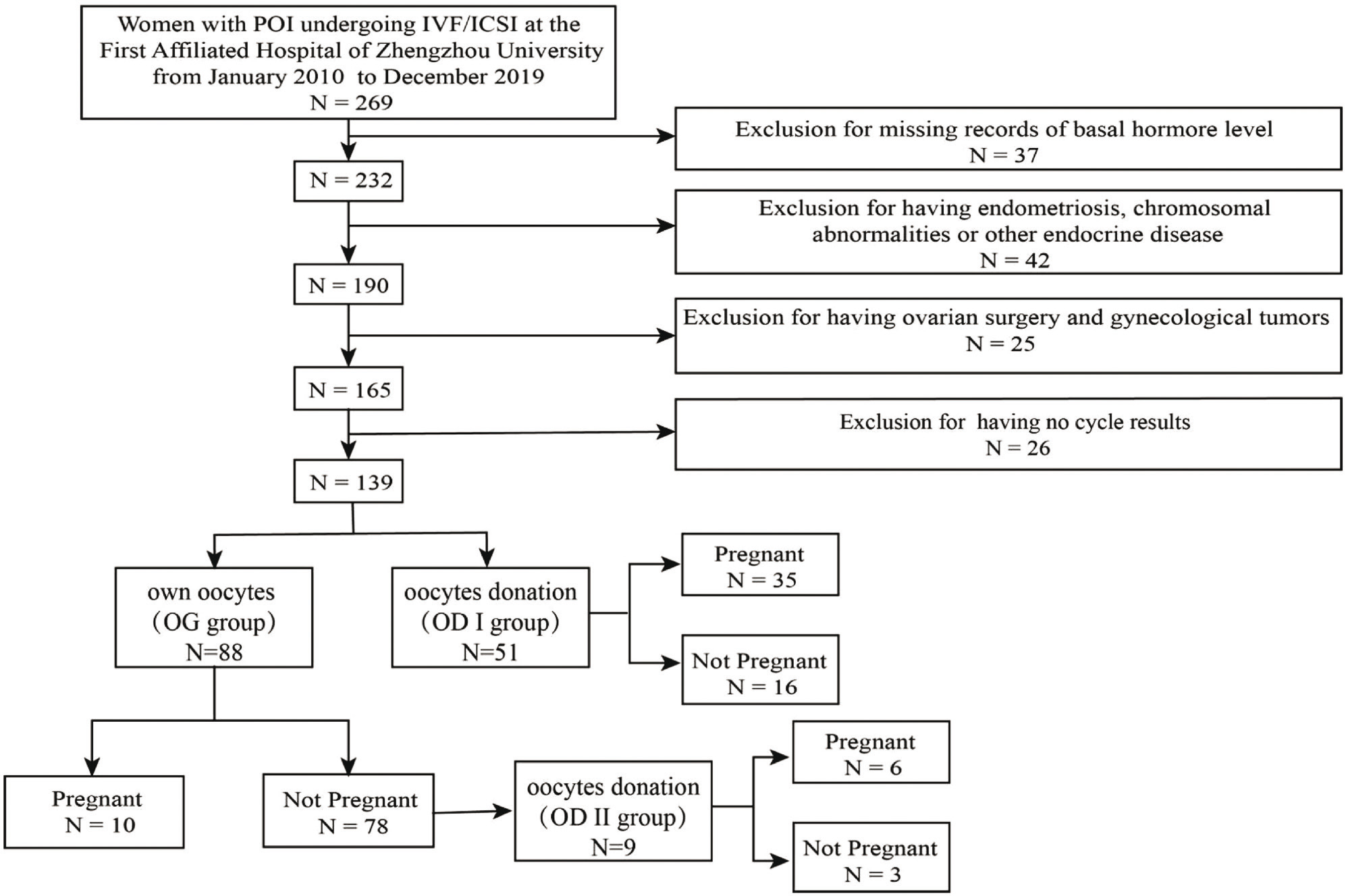 L'étude incluait 139 femmes avec un diagnostic d'IOP ayant entrepris un parcours d'AMP entre 2010 et 2019 dans l'hôpital de Zhengzhou en Chine. Les critères diagnostic d'IOP étaient : aménorrhée ou oligoménorrhée depuis plus de 4 mois et un taux de FSH > 25 à deux reprises. À noter que les patientes ayant d'autres pathologies pouvant altérer la fertilité étaient exclues.
