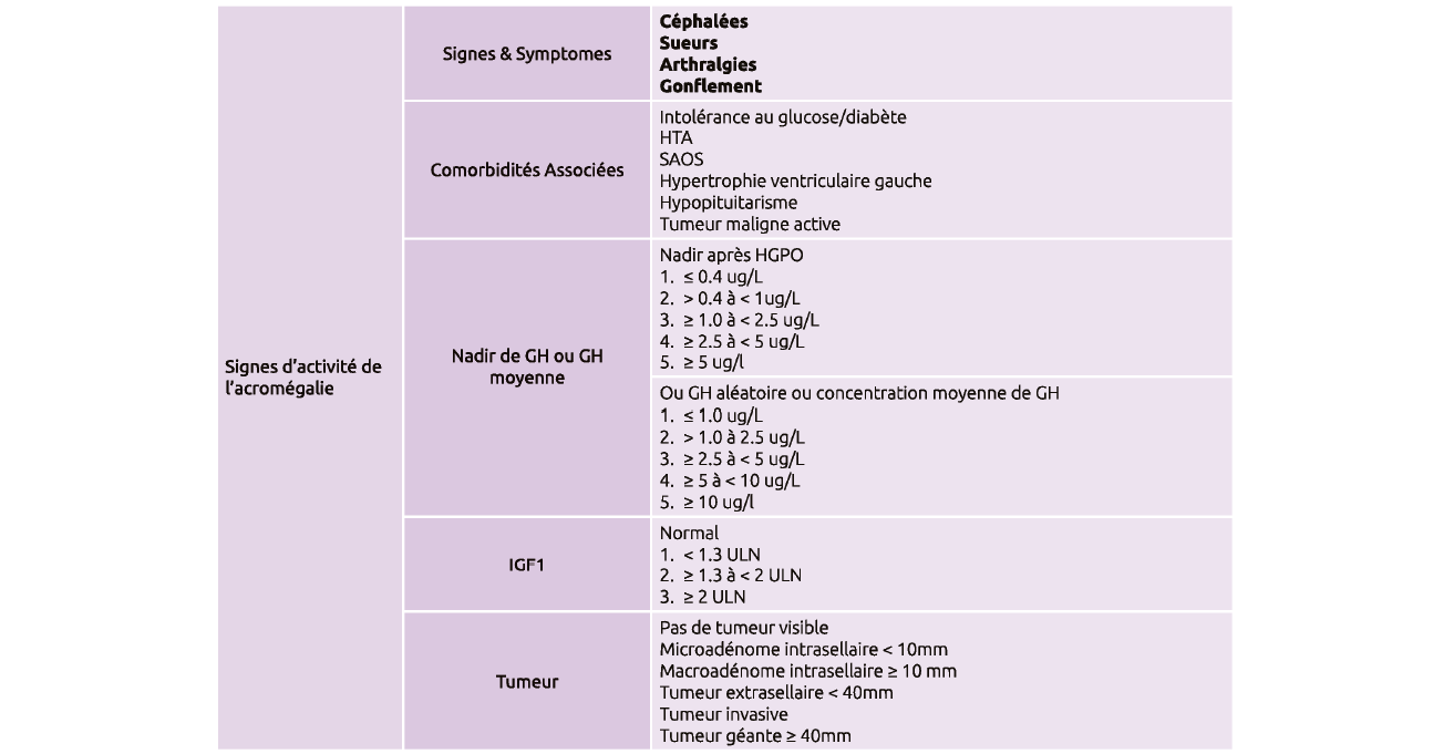 Le score d'activité de l'acromégalie « SAGIT » de 0 à 22 proposé par un consensus d'experts décrit les 4 signes d'activité principaux : céphalées, sueurs, arthralgies, gonflement. Certaines comorbidités sont présentes dès le diagnostic (DT2, HTA).