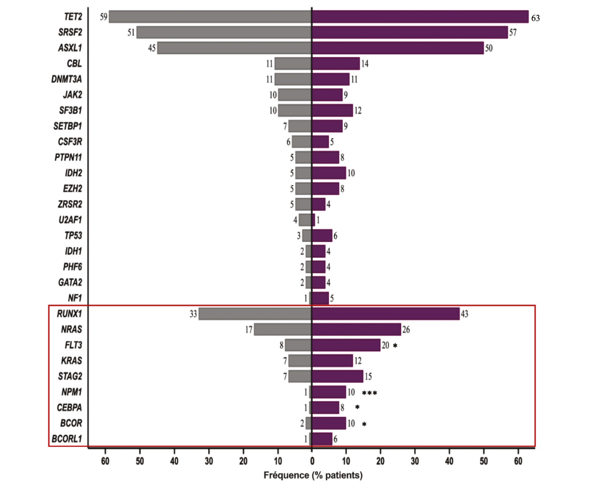 Figure 3. Fréquence des mutations au diagnostic de LMMC et de LAM.
