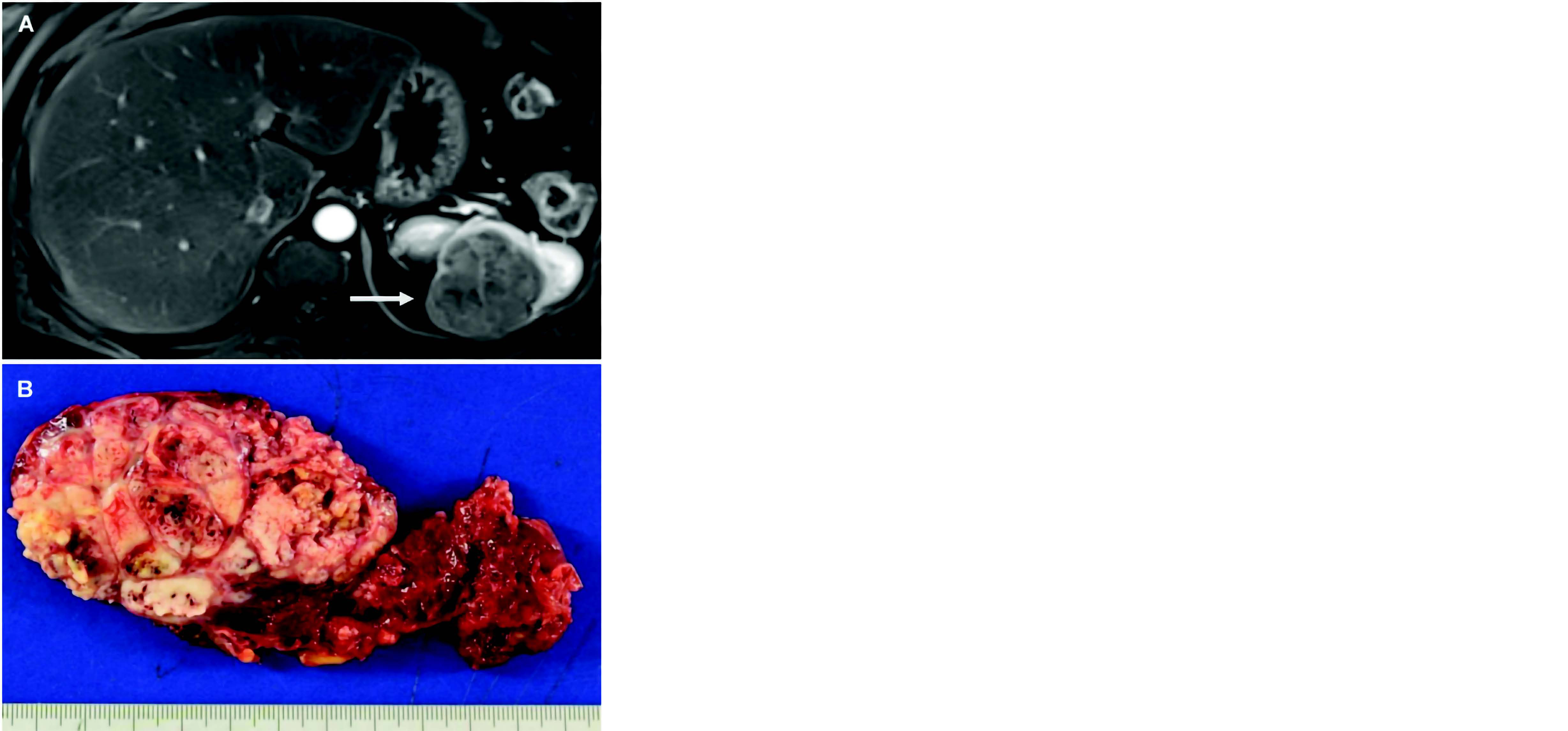 Figure 2 : A – IRM abdominale en coupe transversale en séquence T1 après injection de gadolinium montrant la lésion splénique hypointense. B – Pièce opératoire de splénectomie vaec une lésion polylobée, focalement hémorragique avec parenchyme splénique congestif