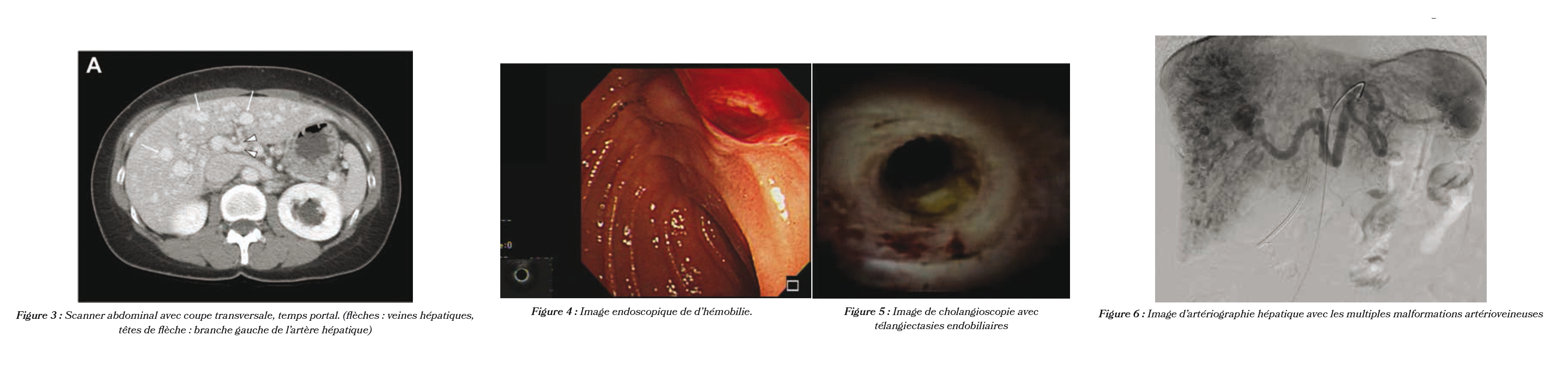 L'atteinte hépatique est surtout celle d'une hypertension portale non cirrhotique sur les malformations artério-veineuses et une cholangite ischémique liée au vol vasculaire intra-hépatique menant à une cirrhose biliaire secondaire. Les télangiectasies biliaires sont une manifestation rare et méconnue de la maladie.
