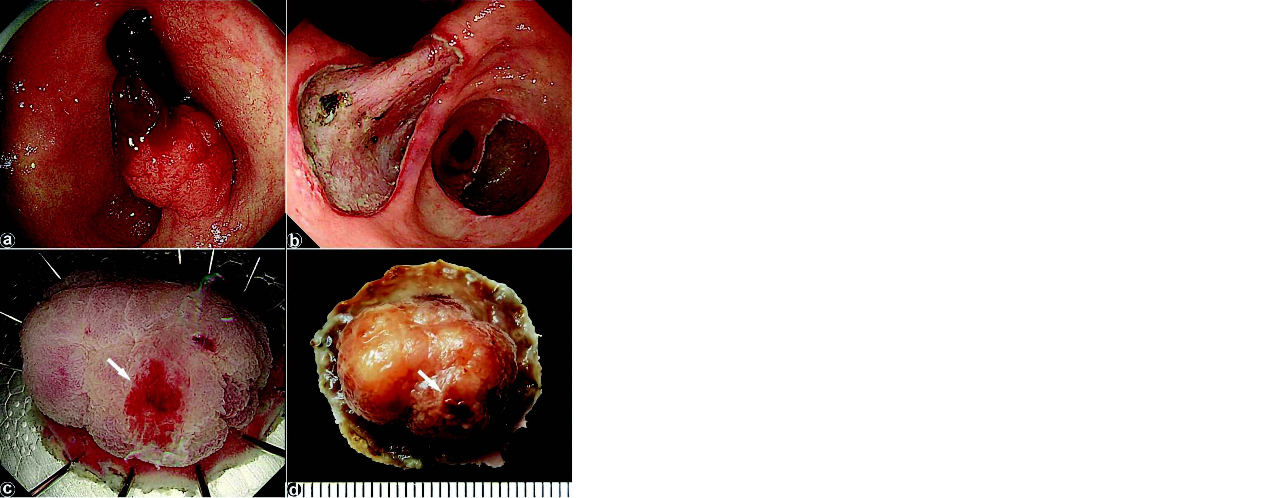 Figure 1 : a) Vision endoscopique de la lésion de l'antre 0-Isp avec caillot adhérent. b) Vision endoscopique directe après résection des deux lésions. c) Pièce opératoire avec vaisseau à l'origine du saignement. d) Pièce après fixation au formol.