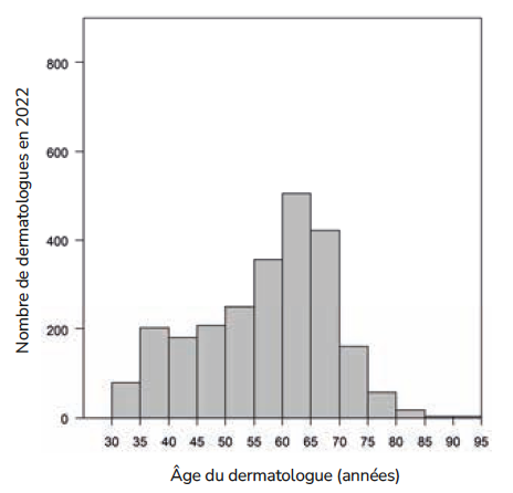 De 2014 à 2022, le nombre de dermatologues actifs en France est passé de 3135 à 2441 soit 694 dermatologues en moins (-22,1 %). La densité nationale moyenne est aujourd'hui de 3,26 dermatologues pour 100 000 habitants, ce qui reste bien en deçà du seuil fonctionnel estimé entre 5 et 6. Seules les régions Provence-Alpes- Côte d'Azur (PACA) et Île-de-France atteignent cette densité.