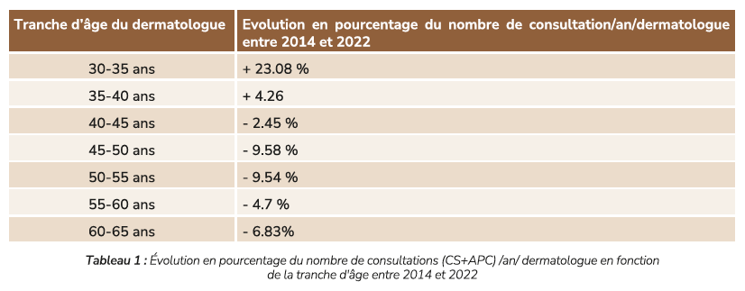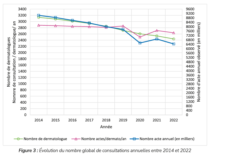L'analyse des données de la CCAM entre 2014 et 2022 [5] montre une baisse de 28,7 % du nombre total d'actes médicaux dermatologiques (consultations, avis ponctuels, dépistages). Cette diminution résulte à la fois de la réduction du nombre de dermatologues en exercice et d'une baisse de l'activité moyenne par praticien (-8,45 %).
