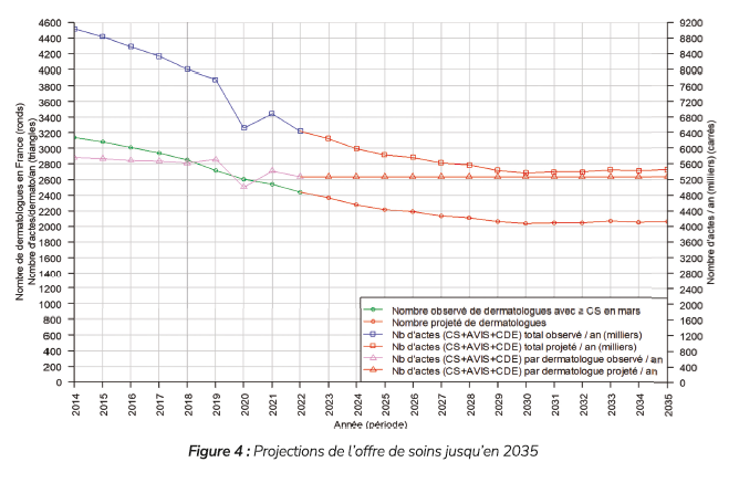 La difficulté d'accès aux soins dermatologiques en France est pluri- factorielle. La principale cause est une diminution massive du nombre de dermatologues, mais également une demande croissante du nombre de consultations en lien avec le vieillissement de la population. On observe également une légère diminution de l'activité médicale, probablement liée en partie aux actes de dermatologie esthétique, bien que cette tendance soit moins marquée que ce qui est souvent suggéré. Contrairement aux idées reçues, ce sont les jeunes dermatologues qui pratiquent le plus d'actes médicaux. Les projections à l'horizon 2035 indiquent une poursuite du déclin du nombre de dermatologues, avec un impact prévisible sur l'offre de soins. Si les nouveaux entrants dans la profession peuvent compenser une partie de cette baisse par une activité plus soutenue, cela ne suffira pas à répondre aux besoins croissants liés au vieillissement de la population.