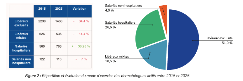 Le nombre de dermatologues exerçant exclusivement en libéral a chuté de 34,4 %. En 2025, cette activité repose principalement sur une population de plus de 60 ans, sans renouvellement assuré. Parallèlement, le nombre de praticiens exerçant de façon intermittente (remplaçants, temps partiel) a augmenté de 25,8 %, traduisant un recours croissant à des formes d'exercice discontinues. Les dermatologues de moins de 40 ans sont majoritairement salariés hospitaliers, ce qui traduit une réorientation vers le secteur public. Ces évolutions témoignent d'un désengagement progressif vis-à-vis de l'exercice libéral traditionnel, perçu comme contraignant et isolé, au profit de modalités plus flexibles ou salariées.