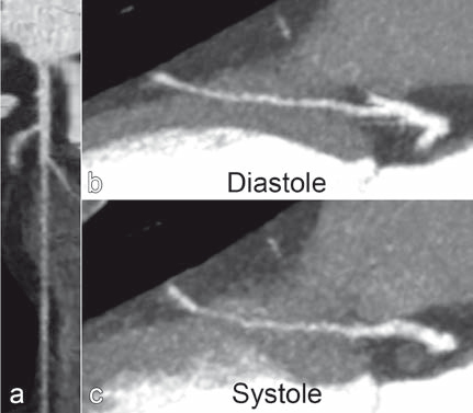 Figure 7 : Visualisation du pont myocardique sur la reconstruction curviligne dans l'axe du vaisseau (a). En diastole (b), le myocarde relâché ne sténose pas de l'artère coronaire, alors qu'il la sténose en systole (c).
