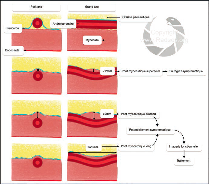 Décrit pour la première fois par Reyman en 1737, le « myocardial bridge » est défini comme étant un recouvrement segmentaire d'une artère coronaire par une bande myocardique dans son trajet naturel épicardique. Considéré chez l'humain comme une variante anatomique plutôt qu'une anomalie congénitale, il semble être un vestige génétique de l'évolution naturelle embryologique (la formation des coronaires se fait à partir du muscle cardiaque, fusionnant dans un second temps au niveau de la racine de l'aorte sous forme de deux artères. L'orientation des vaisseaux vers l'aorte serait secondaire à la présence de cardiomyocytes dans la racine de l'aorte). Hautement prévalent, il représente l'anomalie coronaire la plus fréquente chez l'humain.