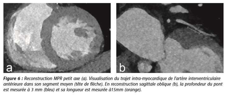 Les images montrent la présence d'une plage de tissu de densité myocardique engainant de manière circonférentielle la portion moyenne de l'IVA (fig. 6a). La coupe sagittale dévoile bien la course intra-myocardique de l'IVA sur environ 15 mm et d'une profondeur de 3mm (fig. 6b), par opposition au trajet épicardique normal de la coronaire droite et du tronc commun gauche. Cette anomalie correspond donc à ce que l'on appelle un pont myocardique qui est susceptible d'expliquer l'épisode angineux. Par ailleurs, le coroscanner n'a pas révélé de coronaropathie.