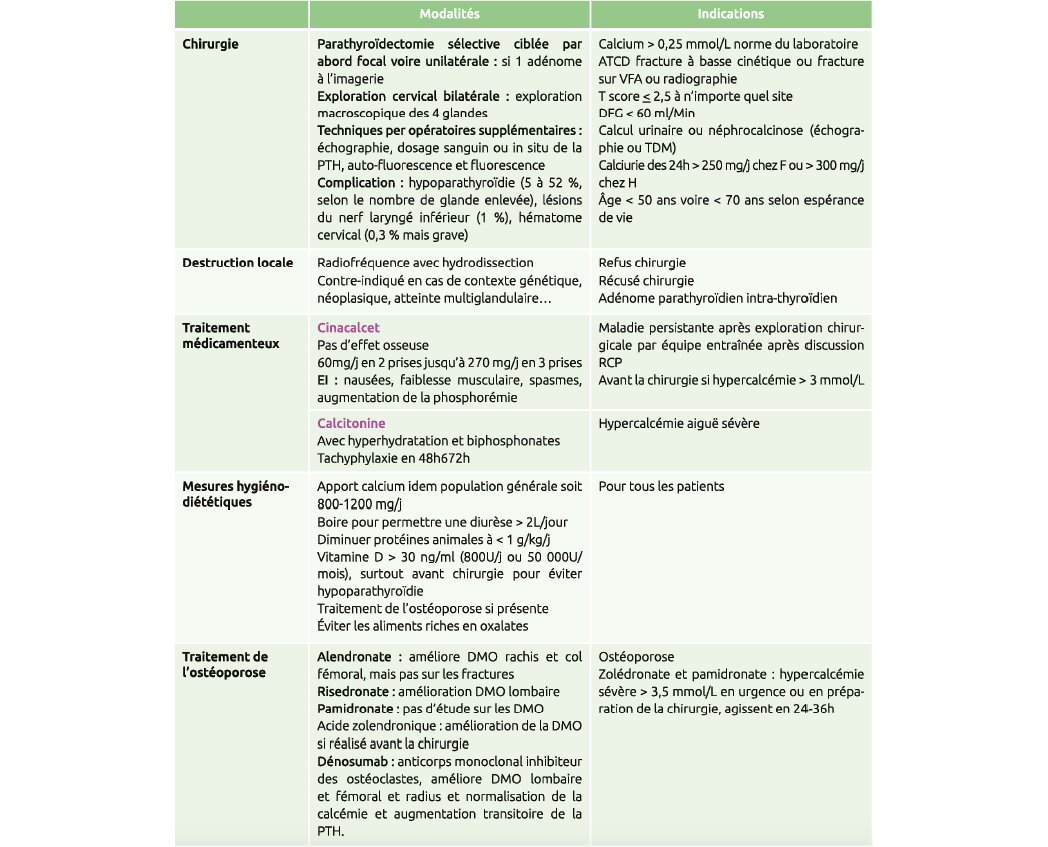 La prise en charge est médicale (cinacalcet) si besoin et chirurgicale de préférence R0, sans curage +/- radiothérapie.