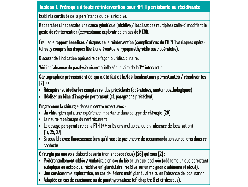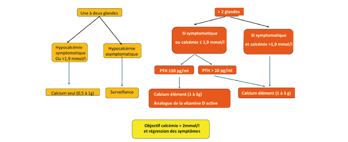 Une PTH élevée n'est pas signe de persistance. L'hypoparathyroïdie persistante supérieur à 6-12 mois est considère comme permanente et doit être surveillée mensuellement pendant 12 mois. Elle doit être supplémentée par vitamine D active, et sels de calcium, selon le nombre de glandes restante.