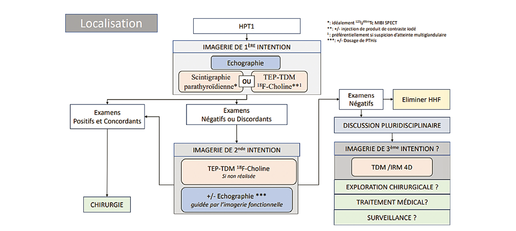 Note du relecteur : On dit classiquement que l'imagerie ne doit être réalisée qu'en cas de chirurgie indiquée… or l'imagerie n'a pas qu'un rôle de localisation de l'adénome car l'étude approfondie de la thyroïde et du cou peut poser une indication de cervicotomie pour une autre raison et faire, in fine, se reposer la question de l'ablation de l'adénome puisque ce n'est pas ce dernier qui motive la cervicotomie. J'encourage les lecteurs motivés à se former à l'échographie et à contribuer ainsi à affiner le raisonnement thérapeutique de leurs patients atteints d'HPP.