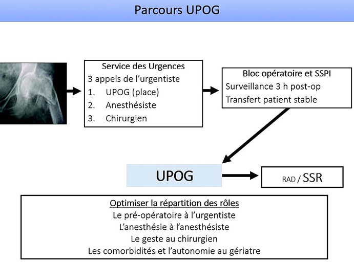 Le concept d'UPOG a été développé en France depuis 2009, avec la création de la première UPOG à l'hôpital de la Pitié-Salpétrière. Celle-ci s'est inscrite dès sa mise en place dans une fi lière allant de l'admission aux urgences, l'opération, l'admission post-opératoire directe à l'UPOG jusqu'à la rééducation en SMR au décours dans un service d'aval également spécialisé en orthogériatrie (Figure3).
