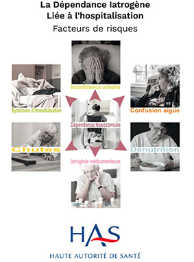 Malgré toutes ces bonnes pratiques, il reste encore des risques d'iatrogénie par les soins hospitaliers prodigués, pouvant entraîner une dépendance chez le patient au décours du séjour. C'est le principe de dépendance liée à l'hospitalisation (DLH) qui peut devenir iatrogène (DILH) quand les soins ne sont pas justifiés ou optimaux (Figure 1 page suivante). Ses 6 principaux facteurs de risques ont été définis par la HAS en 2017 (17) et se doivent également d'être le plus contrôlés possibles : (1) le syndrome confusionnel ; (2) la chute hospitalière ; (3) l'incontinence urinaire et fécale induite par les soins ; (4) l'iatrogénie médicamenteuse ; (5) le syndrome d'immobilisation et (6) la dénutrition secondaire à l'hospitalisation.
