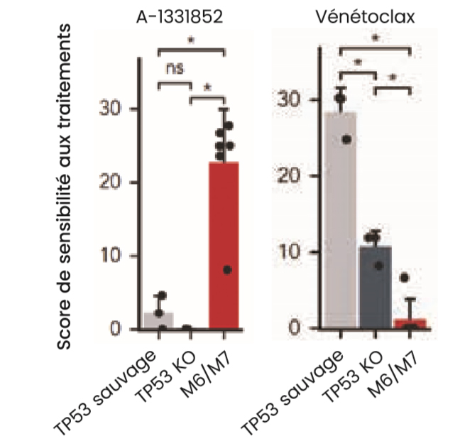 Ensuite, le rôle des mutations de TP53 a été évalué dans la sensibilité des cellules des différentes lignées aux agents pharmacologiques par une approche d'extinction du gène et d'exposition aux molécules d'intérêt. Il apparaît que les cellules des différentes lignées perdant l'expression de TP53 présentent une diminution significative de leur sensibilité au vénétoclax sans perte de sensibilité aux inhibiteurs de BCL-XL (Figure 2).