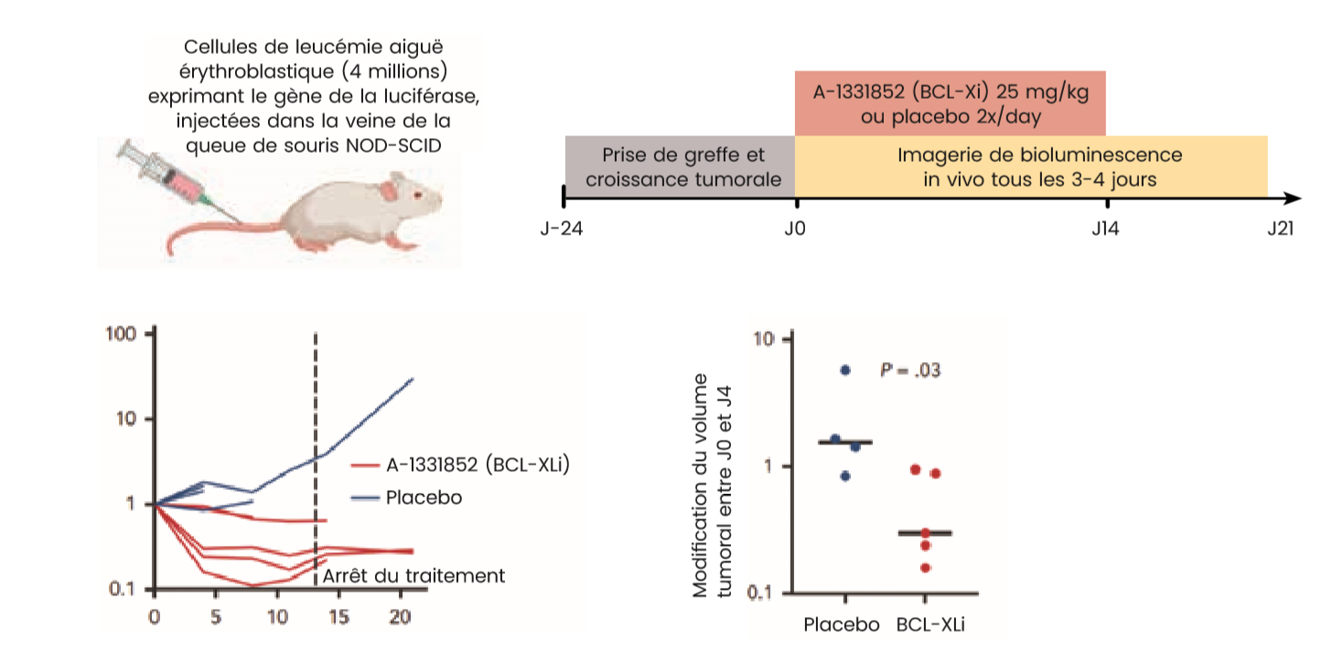 Dans le modèle murin de greffe leucémique érythroblastique avec un suivi de bioluminescence tumorale, a été introduit le A-1331852 en prise orale deux fois par jour. L'inhibiteur de BCL-XL a permis de réduire la masse tumorale de façon significative dans la majorité des cas. Cependant chez certaines souris les cellules tumorales ont persisté sous exposition au A-1331852 et ont proliféré dans les deux semaines suivant l'arrêt de l'exposition à l'inhibiteur.