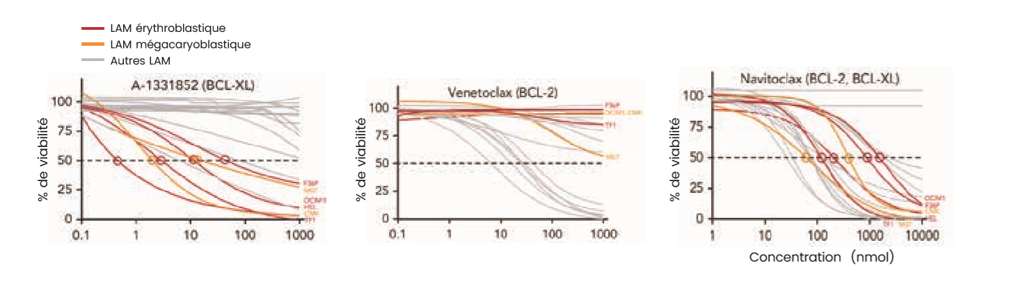 En comparant la réponse des lignées entre elles, les auteurs se sont aperçus que la sensibilité aux inhibiteurs de BCL2 et de MCL-1 était diminuée dans les lignées éry-throblastiques et mégacaryoblas-tiques en comparaison à d'autres lignées de LAM. Enfin le navitoclax4 à la fois inhibiteur de BCL2, BCL-XL et BCL-W a montré son efficacité dans les différentes lignées mais celle-ci semble moindre que celle des inhibiteurs sélectifs de BCL-XL dans les lignées érythroblastiques et méga-caryoblastiques.