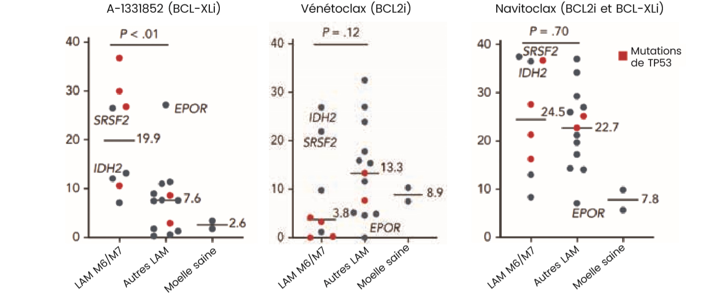 Les blastes de patients dont la LAM était de type M6 (5 patients) et M7 (3 patients) ont également fait l'objet de tests de sensibilité aux inhibiteurs de BCL-XL et de BCL2. Parmi ces patients, 4 étaient réfractaires à l'association d'un agent hypo-méthylant avec le vénétoclax. Les résultats montrent une plus grande sensibilité à l'inhibiteur de BCL-XL en comparaison au vénétoclax sauf chez les patients porteurs de mutations IDH2 ou SRSF2. De fait, ces mutations sont connues pour favoriser la dépendance à BCL2. Enfin, les cellules de patients présentant une mutation de TP53 étaient sensibles à l'inhibiteur de BCL-XL et moins au vénétoclax.