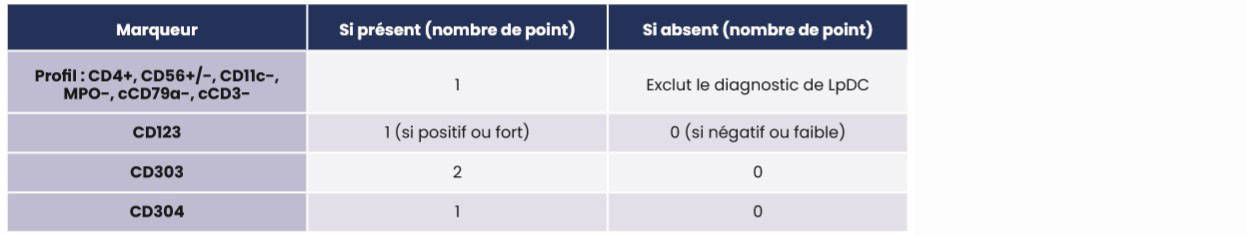 Afin d'aider les biologistes pour le diagnostic, un algorithme d'analyse des marqueurs phénotypiques par CMF ainsi qu'un « score LpDC » ont été proposés en 2009 par Garnache-Ottou et al9. Ce score, sur 5 points, permet de distinguer la LpDC d'autres hémopathies malignes dont la présentation biologique et clinique peuvent être similaires. Un score supérieur ou égale 3 permet de confirmer le diagnostic de LpDC. (Tableau 1)