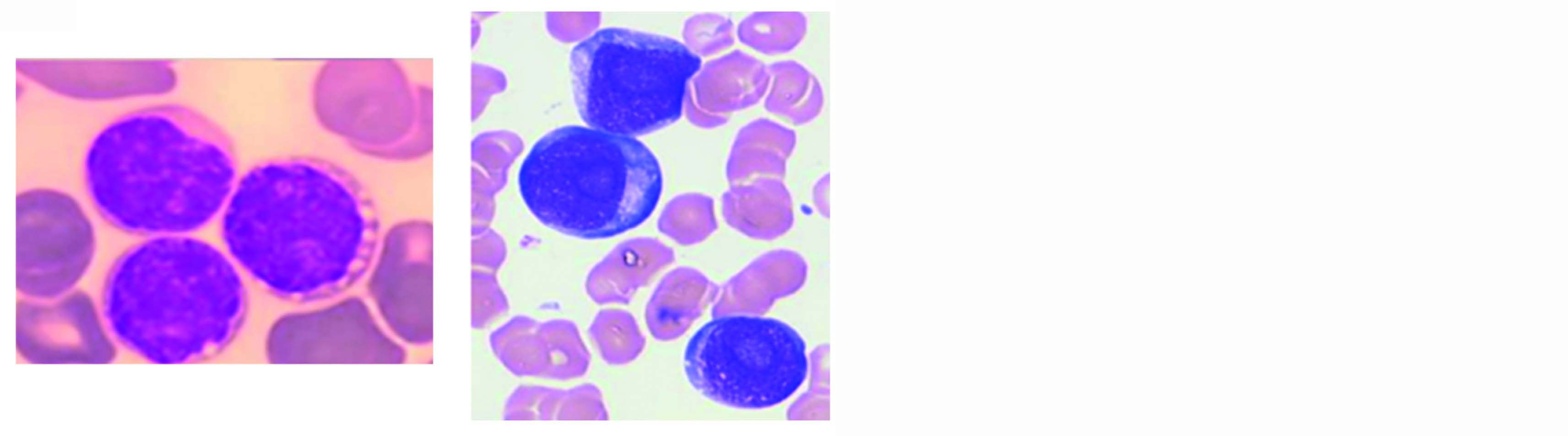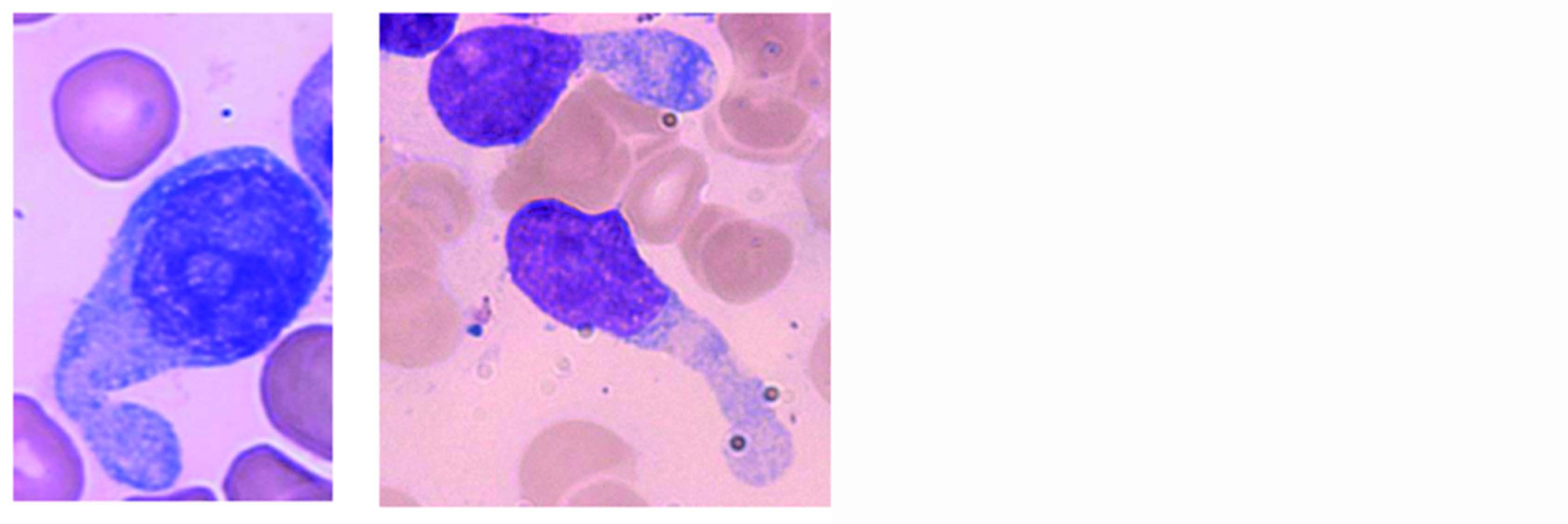 En cas de dissémination de la pathologie, l'examen cytologique du frottis sanguin ou médullaire est la première étape de l'orientation diagnostique d'une LpDC. La morphologie typique est celle de cellules de taille moyenne présentant un noyau rond, le plus souvent régulier, souvent excentré et au nucléole visible. Le cytoplasme est légèrement basophile et contient des petites vacuoles disposées en collier de perles sous le noyau. La présence d'un pseudopode donne à la cellule sa forme classique en miroir à main. (Figure 1A)3.