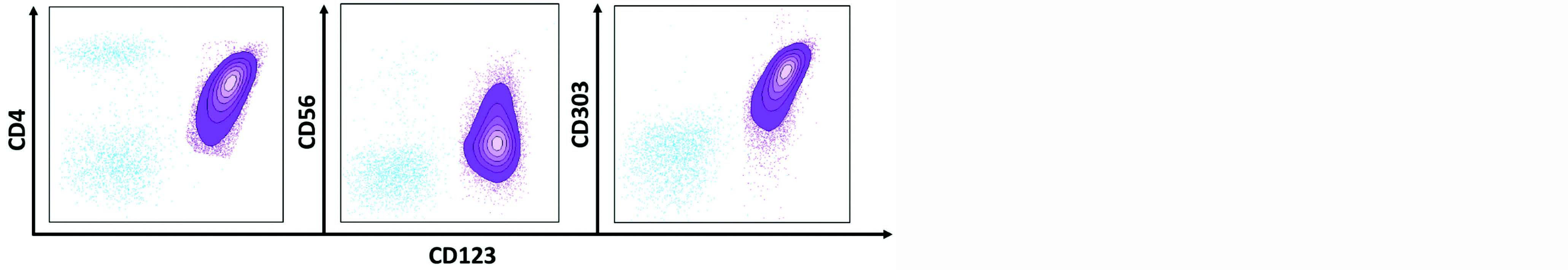En CMF, on identifie une population de blastes myéloïdes (CD34+ ou CD34- selon le type de LAM) et un contingent, plus ou moins important mais dont le seuil est dans la littérature fixé à au moins 2 %, de pDC CD123+ CD4+ mais CD56-10, 11.