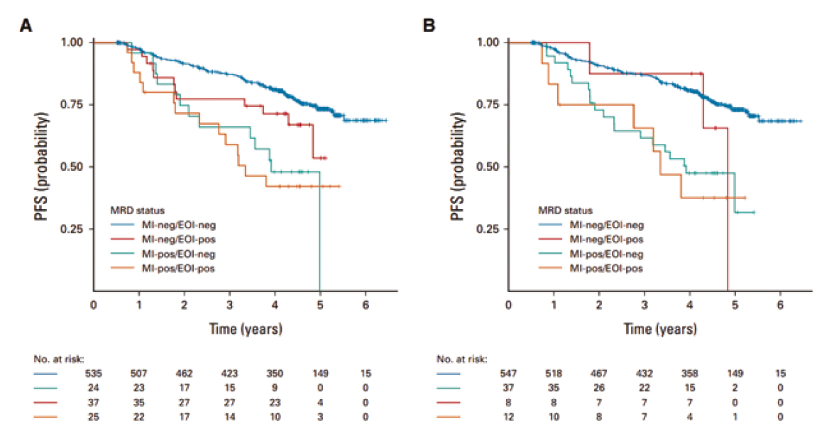 Figure 1 : Survie sans progression à partir de la randomisation en fonction du statut de la MRD à l'EOI. (A) Répondeurs tardifs (MI positif/EOI-négatif) versus répondeurs précoces (MI-négatif/EOI-négatif) : HR, 3,11 ; P =0.00011. (B) Répondeurs tardifs versus répondeurs précoces : HR, 3,04 ; P < 0,0001.