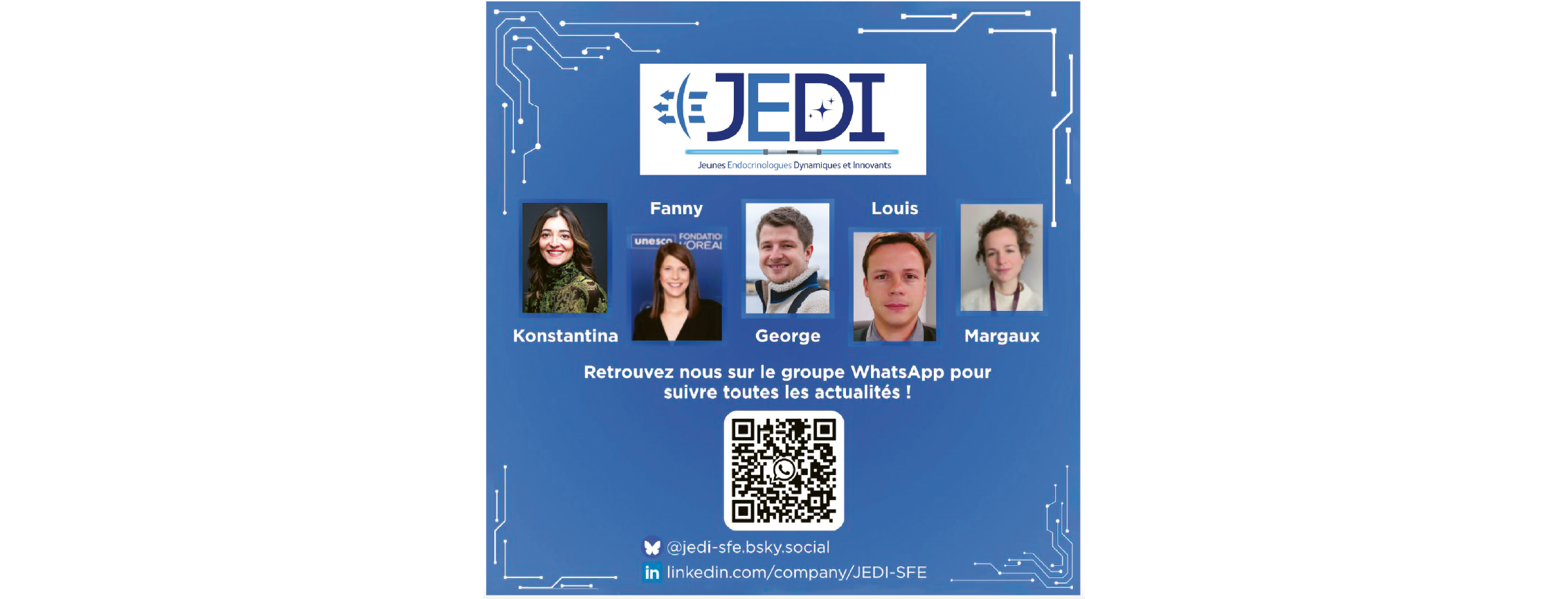 Au total, rejoindre la communauté JEDI, c'est contribuer à une dynamique collective soutenue par la SFE qui dépasse les lieux d'exercice et unit jeunes cliniciens et chercheurs autour d'une même ambition : faire progresser l'endocrinologie française et assurer son avenir. Toute suggestion est bien sûr la bienvenue, n'hésitez pas à nous contacter à [email protected] et, pour découvrir nos actions faire partir de ce réseau, à découvrir notre page web.