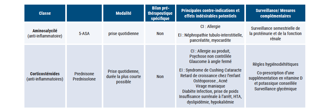Contrairement à la corticothérapie, tous les traitements du tableau 1 sont à la fois des traitements d'induction et d'entretien (sauf l'azathioprine qui est un traitement d'entretien pur).