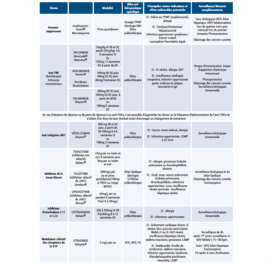 Le calendrier vaccinal doit être tenu à jour. Les vaccins vivants sont contre-indiqués sous biothérapie. La surveillance spécifique de chaque traitement est détaillée dans le Tableau 2. L'anémie et la carence martiale doivent être dépistées. La surveillance endoscopique à intervalles réguliers de dépistage du cancer colorectal ne doit pas être oubliée.