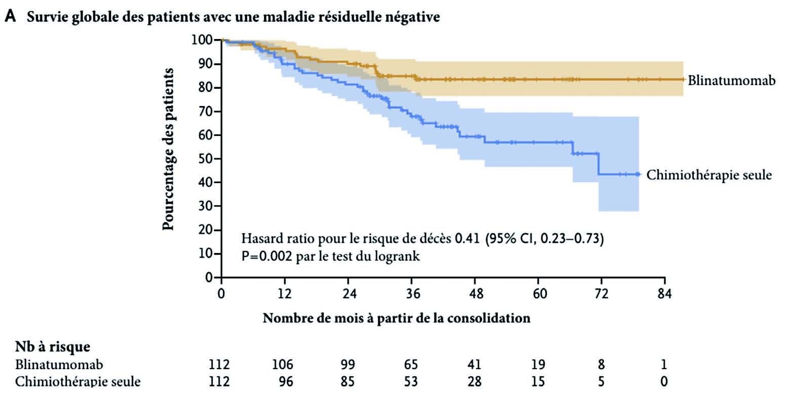 Des résultats similaires ont été obtenus en survie sans rechute à 3 ans avec (80 % dans le groupe Blinatumomab vs 64 % dans le groupe chimiothérapie seule).