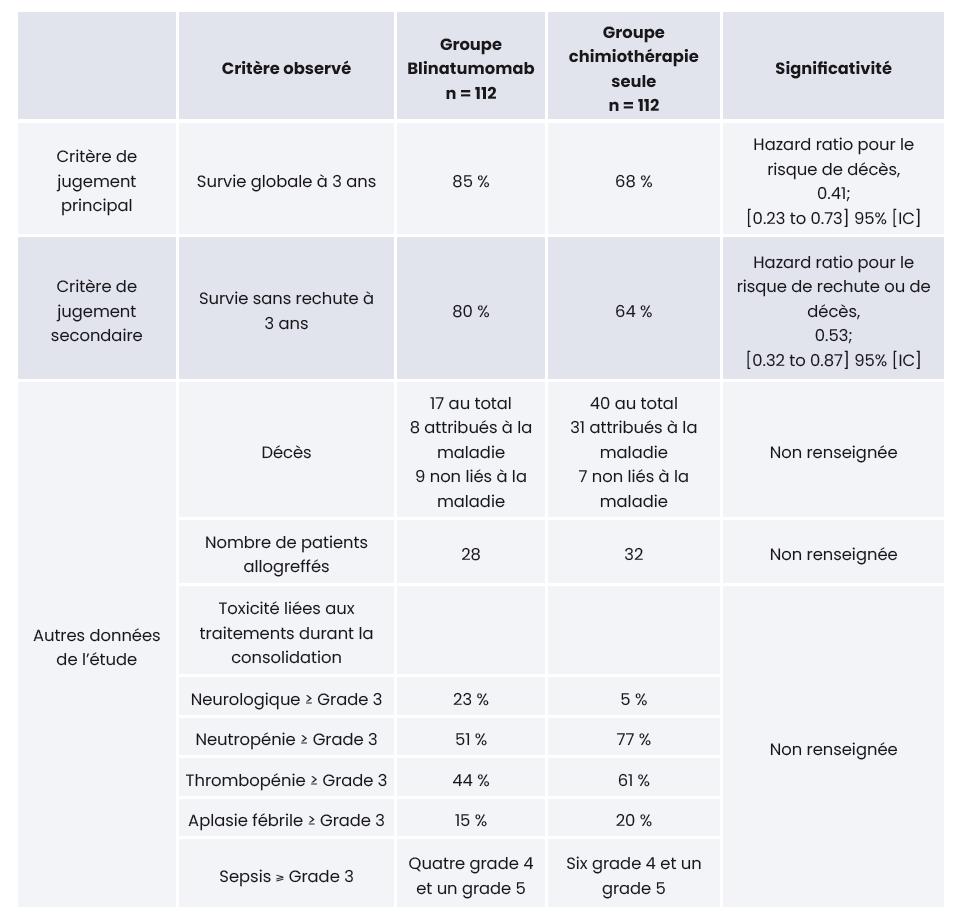 En termes d'efficacité, l'objectif principal a été atteint, la survie globale à 3 ans a été mesurée à 85 % dans le groupe Blinatumomab et 68 % dans le groupe chimiothérapie seule (p=0,002).