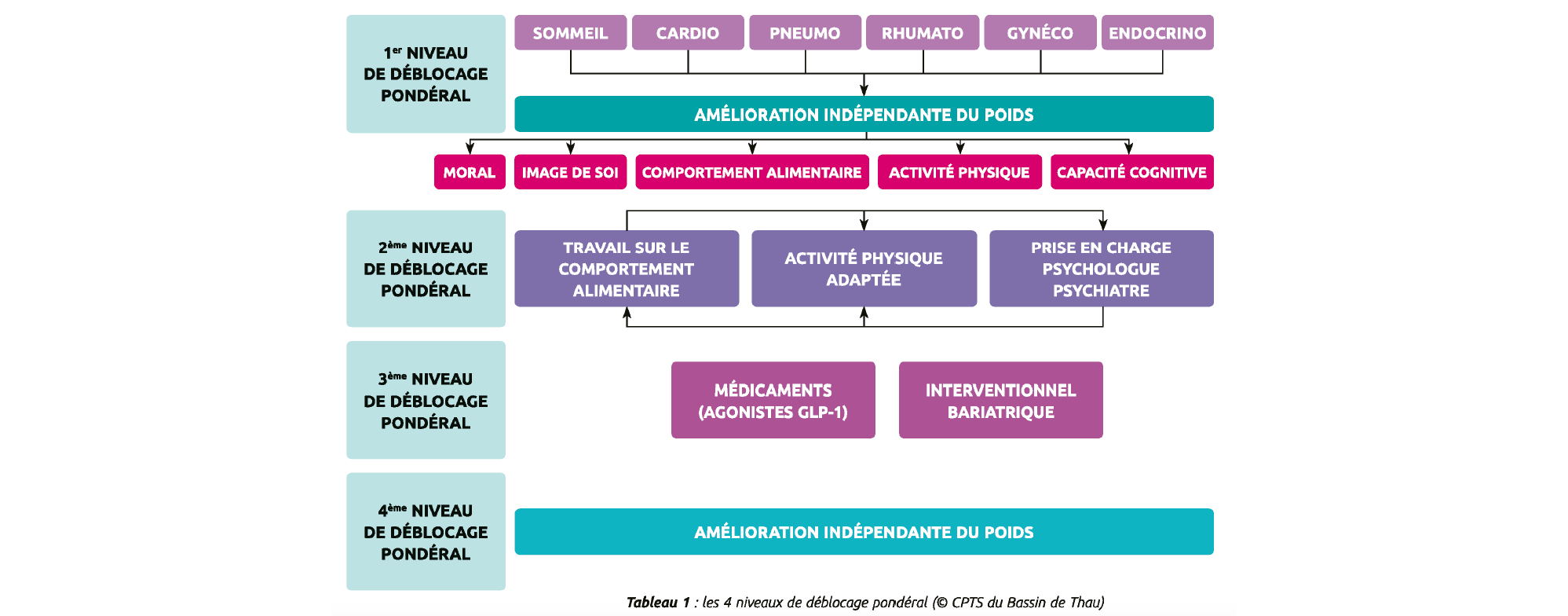 Le 1er niveau de déblocage pondéral a pour spécificité de s'axer initialement sur les complications somatiques en se décentrant totalement du poids (ce qui peut mettre à l'épreuve la légitime impatience des patients et cette légitime impatience est abordée dès le début du parcours et en séance d'ETP en partant du constat que, s'ils sont l., c'est que le reste a échoué). On peut donc ainsi soulager immédiatement et au moins partiellement plusieurs points de souffrance et de handicap du patient. De plus, ce niveau repose sur des évaluations et des prises en charge (cardio, pneumo, gynéco, rhumato) qui, elles, peuvent être agencées indifféremment. Il en résulte déjà des effets positifs dont peut, d'ailleurs, résulter une perte de poids qui n'était pas directement recherchée, provoquant un renforcement positif, d'où le nom de « 1er déblocage pondéral ».