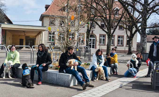 Les familles d’accueil de la région de Mulhouse se réunissent tous les 15 jours dans la cour de l’école du petit village d’Aspach pour 2h de stage. Guidés par Cathy, une bénévole handi’chien formée spécialement au dressage des chiens, les familles et leur chien enchaînent les exercices. Les chiens sont éduqués à l’apport d’objet, la tenue et la posture, le passage de porte, … Chaque chien passe avec son maître pour les exercices individuels, puis ils se réunissent tous pour les exercices collectifs. Lors de ces exercices, les maîtres marchent dans la cour et doivent passer les uns à côtés des autres en apprenant à leur chien à ne réagir à aucun stimulus extérieur. En effet, lorsqu’il sera chien d’assistance, il faudra qu’il reste de marbre auprès de son maître sinon la personne en situation de handicap, imaginons qu’elle soit aveugle, pourrait s’effrayer et mal interpréter la réaction de son chien qui s’agite.