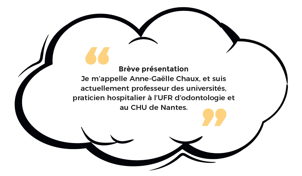 Après les études d'odontologie à Lyon, j'ai passé l'internat en odontologie (à l'époque non spécialisant), car je souhaitais approfondir ma formation en chirurgie et en cancérologie. J'ai été affectée à Lyon, où j'ai pu progresser en chirurgie orale, en cancérologie (stages au centre anticancéreux) mais également en prothèse (adjointe, conjointe, supra-implantaire). En parallèle, j'ai validé mon Master 1, validé le DU de cancérologie des voies aéro-digestives supérieures et commencé le DES de chirurgie buccale. À la fin de l'internat, j'ai été recrutée par un confrère libéral pour développer une activité de chirurgie et implantologie dans leur cabinet. Au bout de 18 mois, on m'a proposé un poste d'assistant hospitalo-universitaire partagé entre la faculté d'odontologie et le centre de lutte contre le cancer.