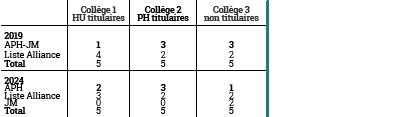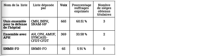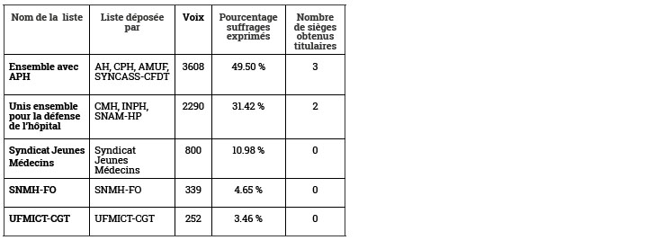 La liste ensemble avec APH a gagné un siège au collège HU, et conserve un siège au collège des non titulaires, Jeunes médecins s'étant présenté séparément.