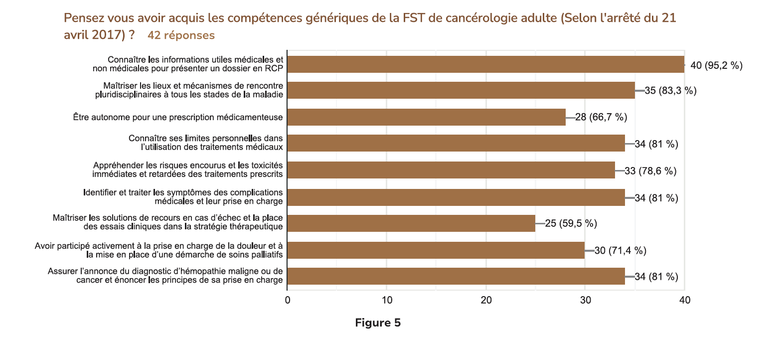 Nos résultats démontrent que les internes ont considéré avoir acquis les compétences génériques des textes officiels (Fig.5). La FST « cancérologie de l'adulte » va probablement bénéficier de la mise en place du séminaire présentiel, avec l'ajout d'un cours qui manquait sur les toxicités cutanées des traitements anticancéreux et la possibilité de tisser du lien entre internes et dermato-oncologues. Notons qu'il faudra veiller à pérenniser le financement du déplacement (transports, logement). Il nous semble indispensable d'inciter les coordinateurs locaux de FST à mettre en place des stages couplés 3 mois / 3 mois pour la radiothérapie.