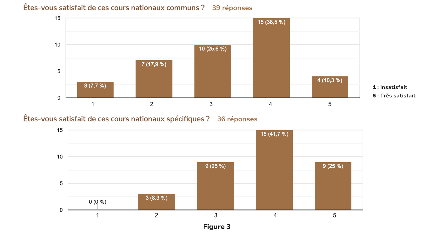 Une demande de formation en présentiel La formation théorique actuelle comporte des cours nationaux communs (en présentiel) avec les internes de phase socle du DES de Cancérologie d'une part, et des cours de cancérologie communs aux autres spécialités d'autre part (en distanciel) avec des cours plus spécifiques à l'onco-dermatologie. La formation théorique proposée était considérée par 53,1 % des répondants comme suffisante pour leur exercice futur. Toutefois, la majorité des répondants (69 %) n'ont pas identifié de thématique manquante au sein de cette formation. Les cours nationaux spécifiques étaient davantage plébiscités que les cours du tronc commun (Fig.3).