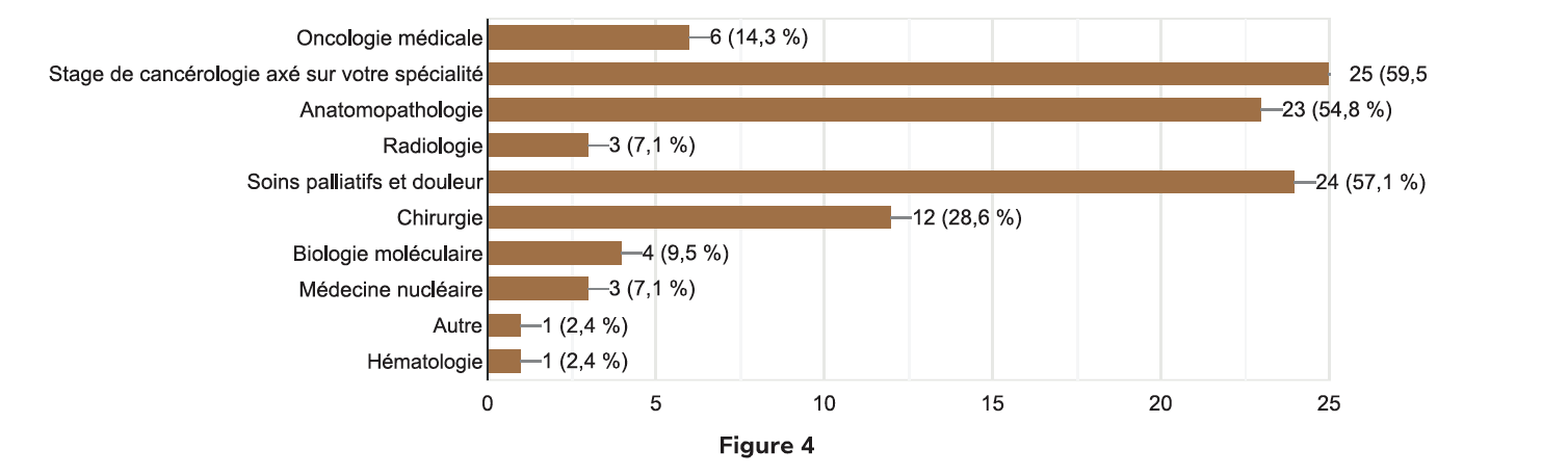 Concernant les stages, 73,8 % des répondants ont réalisé un stage en oncologie médicale (50 % en centre de lutte, 50 % en CHU). Cette formation pratique a été jugée comme suffisante pour l'exercice futur pour 66,7 % des répondants. La grande majorité (78,8 %) a considéré avoir progressé dans la prise en charge de leurs patients atteints de cancers.