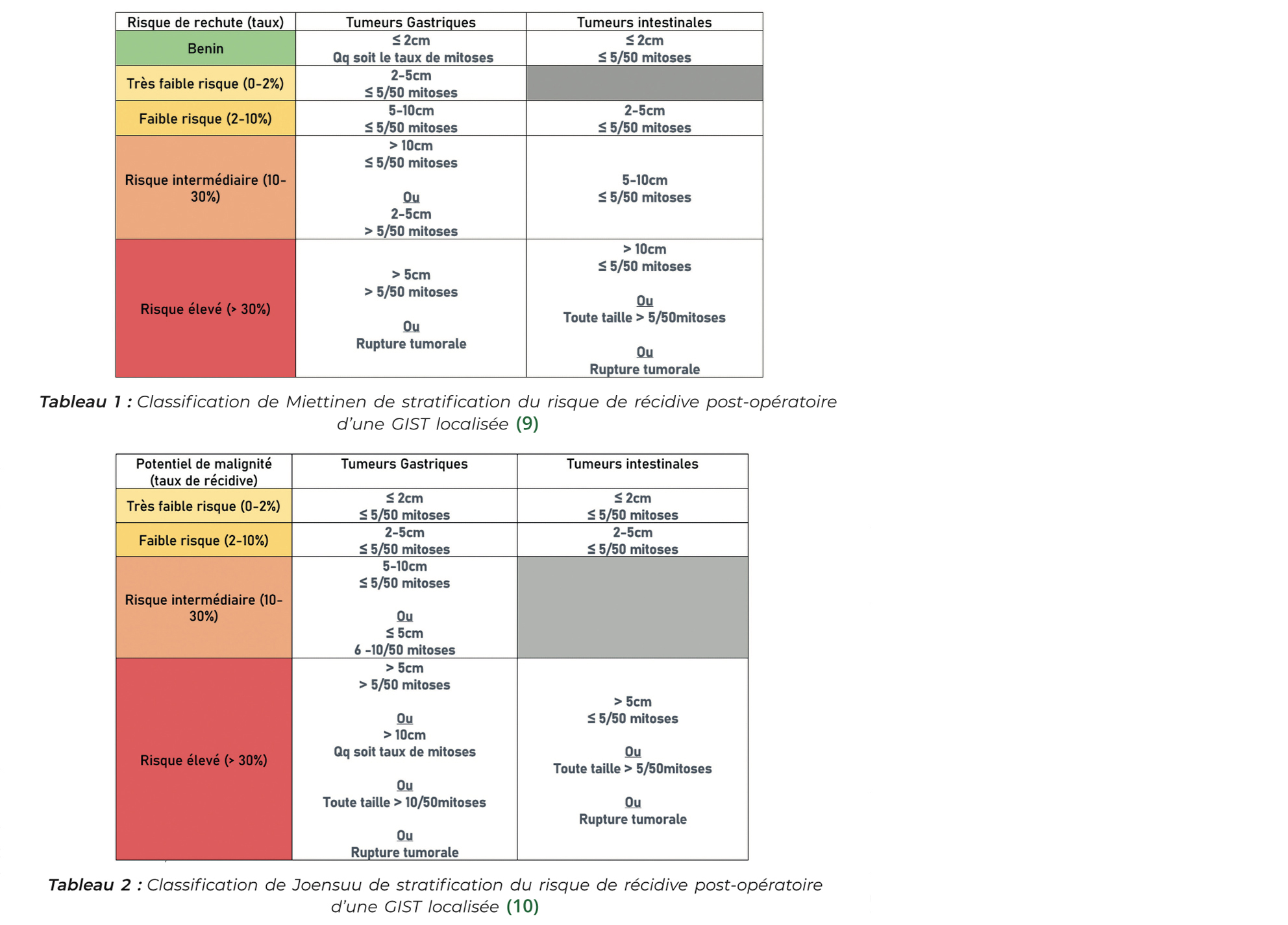 La Classification TNM existe mais est peu utilisée en pratique, les 2 classifications les plus utilisées pour stratifier le risque de récidive sont les classifications de Miettinen (9) et NIH modifiée (ou classification de Joensuu) (10). Ces classifications assez proches, prennent en compte comme facteur de risque de récidive : le site tumoral, la taille tumorale, ainsi que l'index mitotique et la perforation qui est systématique- ment associée à un risque élevé de récidive (avec des pronostics similaires aux malades métastatiques) (10).