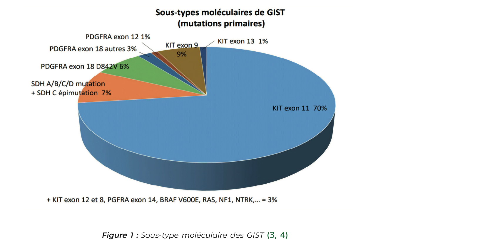 Il est recommandé de réaliser systématiquement un génotypage tumoral permettant de caractériser le sous-type moléculaire de GIST ce qui a un intérêt pronostic et prédictif de réponse au traitement. On retrouve dans la plupart des cas des mutations des gènes codant pour les récepteurs à activité tyrosine-kinase KIT (75 à 80 % des cas) ou PDGF (10 %) (2). La présence de la mutation D842V de l'exon 18 du gène PDGFRA (6 % des cas) rend la GIST primitivement résistante à l'imatinib, cela concerne principalement les GIST gastriques ++++ (2). Enfin, les mutations SDH sont moins fréquentes, principalement en cas de GIST KIT négatif et PDGFRA négatif, elles sont souvent de meilleur pronostic et associées à des formes syndromiques.