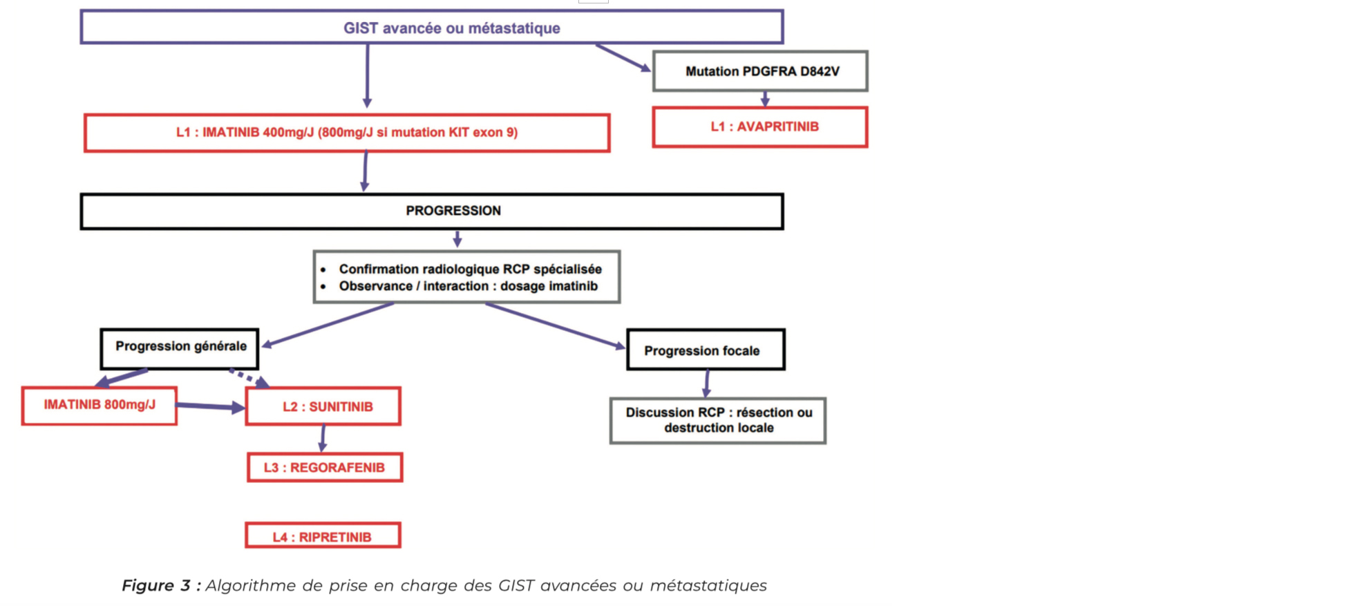 En cas de GIST métastatique avec mutation PDGFRA D842V (résistance primaire à l'imatinib), il existe un inhibiteur spécifique de cette mutation : l'avapritinib, indiqué en première ligne métastatique chez ces patients (16).