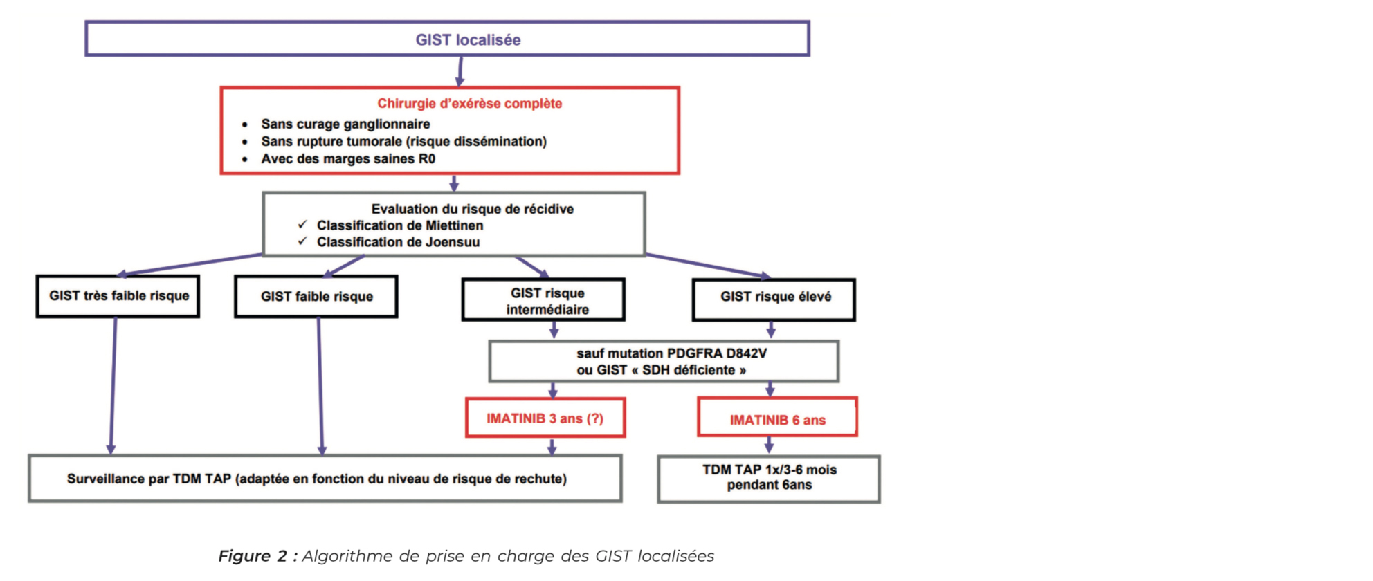 Pour les GIST à haut risque de récidive un traitement adjuvant par imatinib 6 ans est recommandé (11-14). Un traitement adjuvant de 3 ans pour les GIST à risque intermédiaire est à discuter en RCP spécialisée. Il n'y a pas d'indication à la réalisation d'un traitement adjuvant pour les GIST avec mutation PDGFRA de type p.D842V (20 % des GIST de l'estomac) qui ont une résistance primaire à l'imatinib et sont de bon pronostic. Le traitement adjuvant n'est également pas recommandé en cas de GIST « SDH déficiente ».