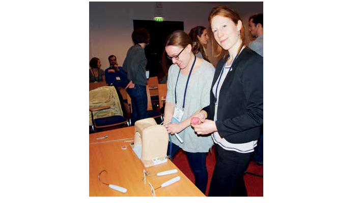 Ainsi, la première journée, les internes pouvaient librement entendre les communications orales, s’accordant quelques pauses dans les stands des sponsors… Tandis que le jour suivant leur était tout dédié à l’entraînement pratique : certaines salles plongées dans une fascinante obscurité se destinaient à l’échographie sur nos jolis et réels mannequins au ventre rebondi, d’autres plus équipées permettaient l’usage de pelvi-trainers, ou simulation de pose de TVT, d’autres encore, beaucoup plus scolaires, affichaient des RCF, des bassins en mousse, ou des vidéos reportages sur une pratique tout aussi terrifiante que tabou : l’excision.