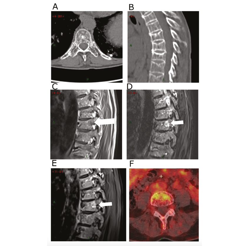 (A-B) Scanner low dose non injecté du rachis thoraco-lombaire retrouvant une déminéralisation avec une trame osseuse hétérogène micro lacunaire au niveau lombaire (A) et des tassements vertébraux thoraciques (B) par insuffisance osseuse dans le cadre de l'ostéoporose. (C-E) IRM du rachis thoracique retrouvant une lésion focale de 8mm au niveau T8 (flèche) avec un hyposignal T1(C), un hypersignal après injection de gadolinium (D) et en séquence STIR (E). (F) TEP-scanner au 18-FDG retrouvant une fixation hypermétabolique avec SUV 4,6 d'une lésion du rachis lombaire.